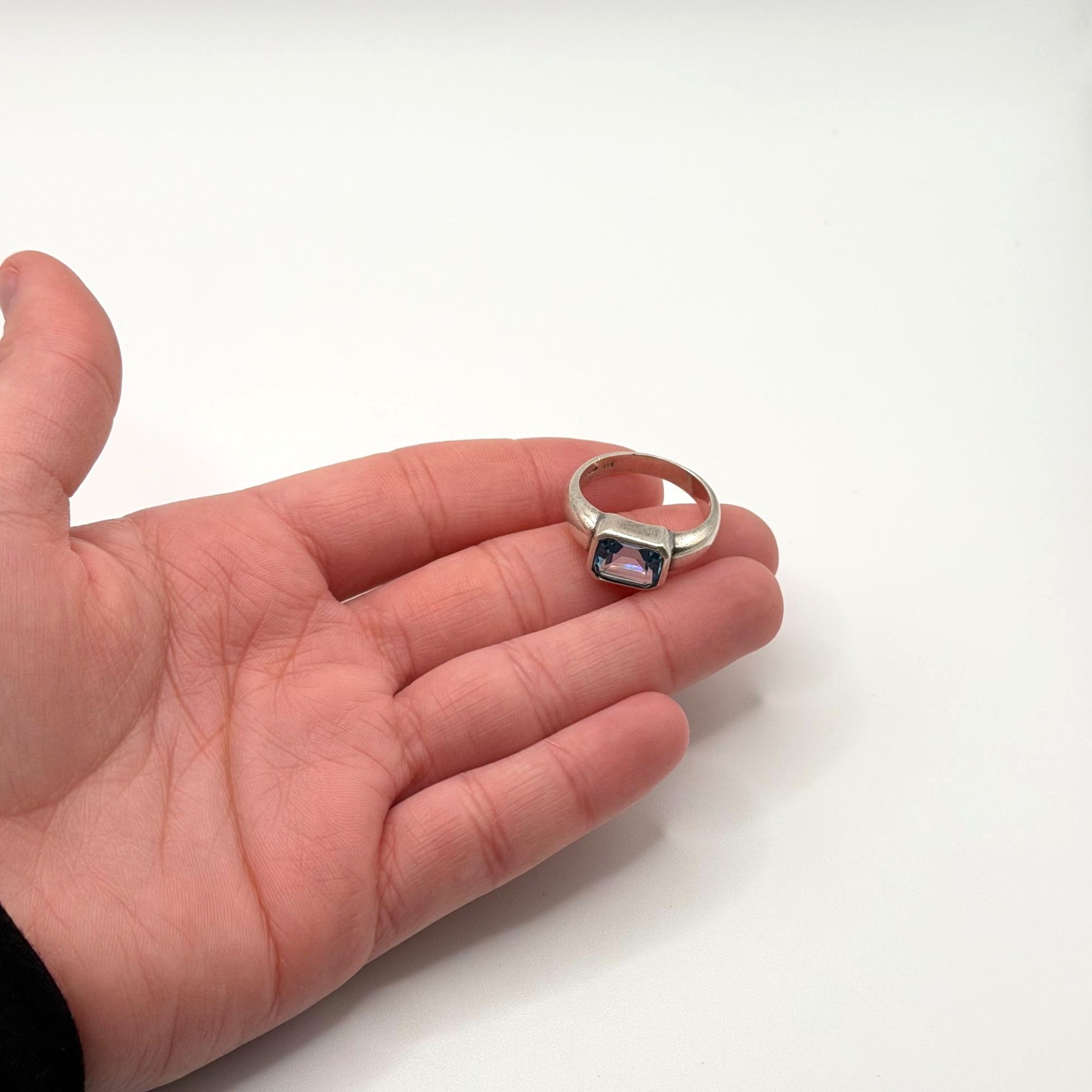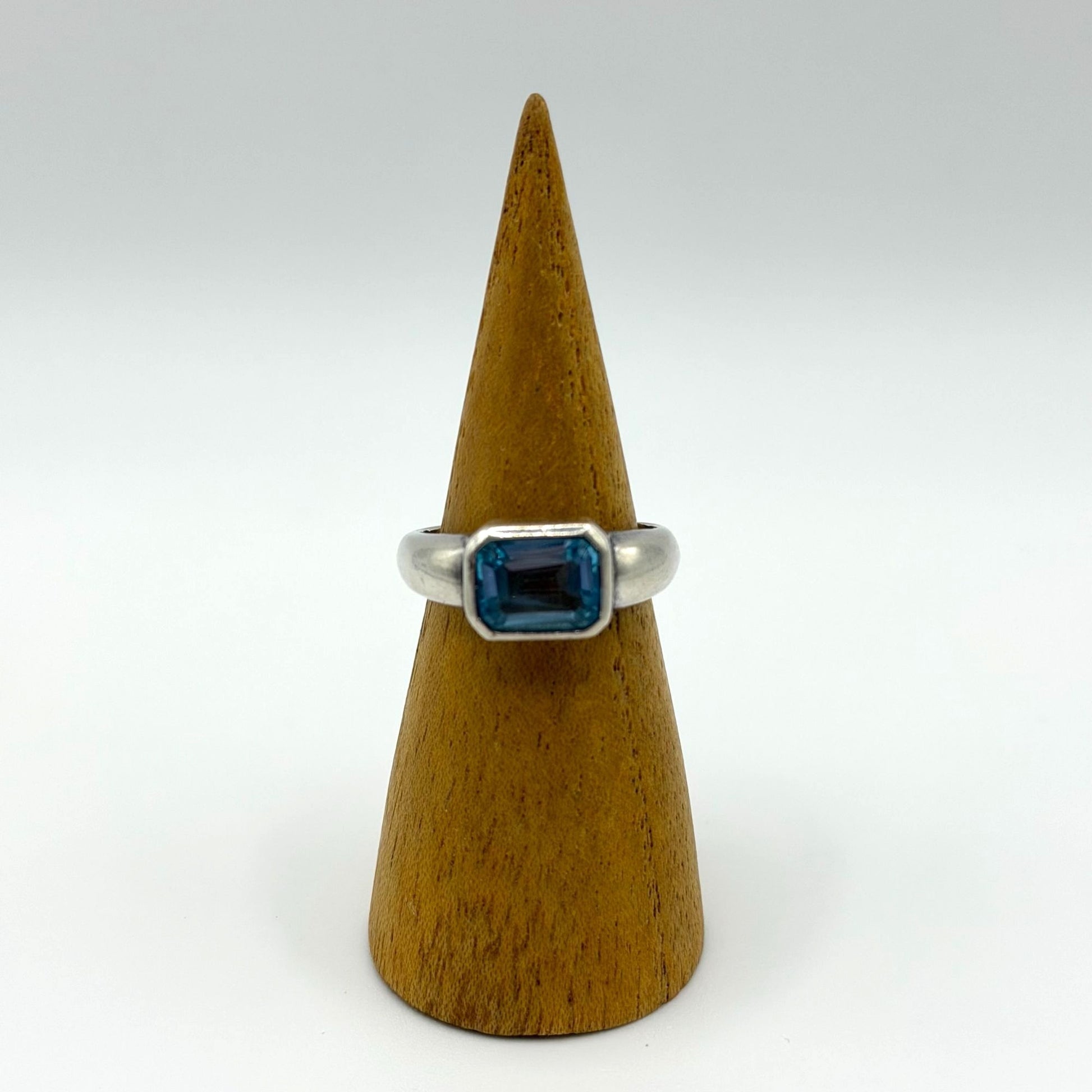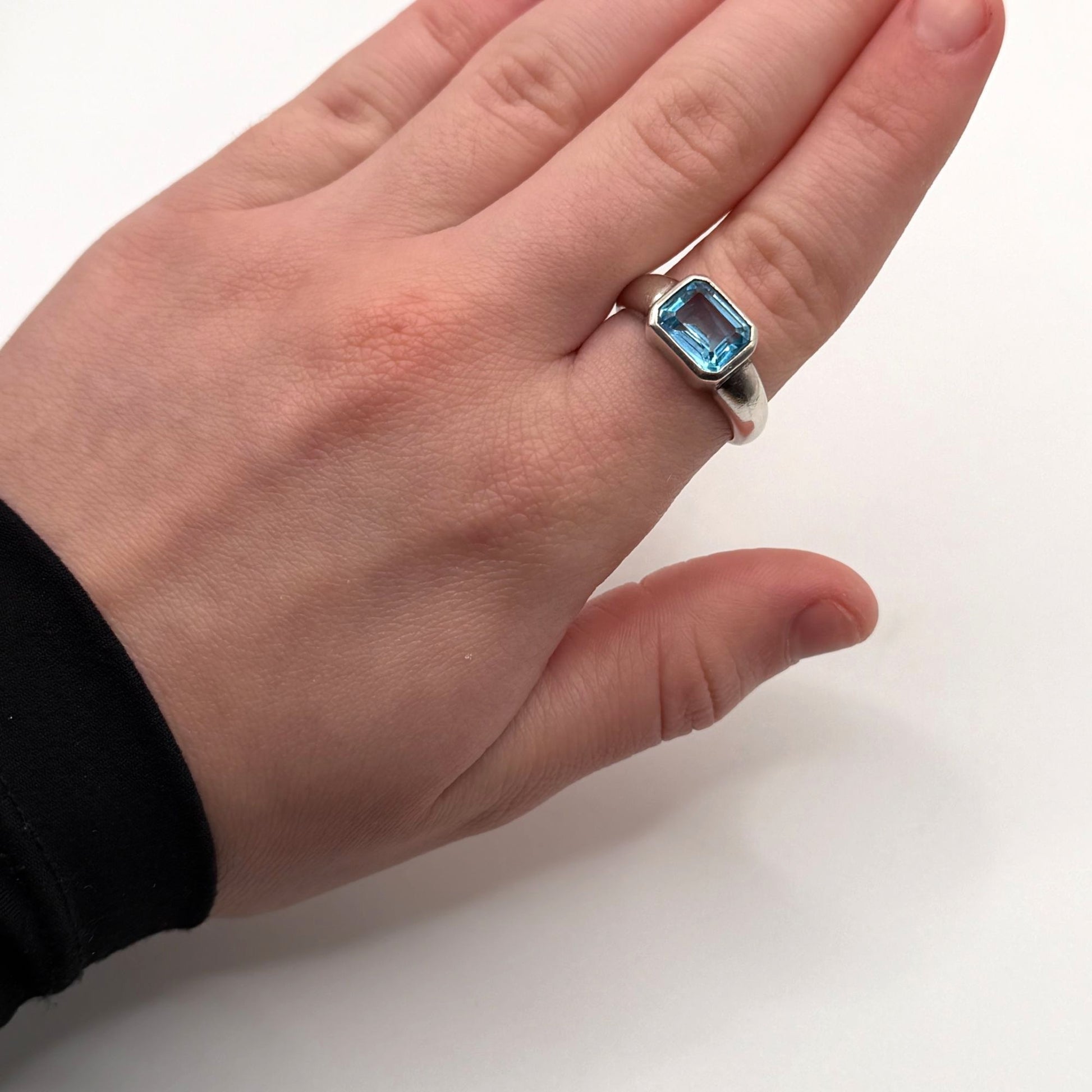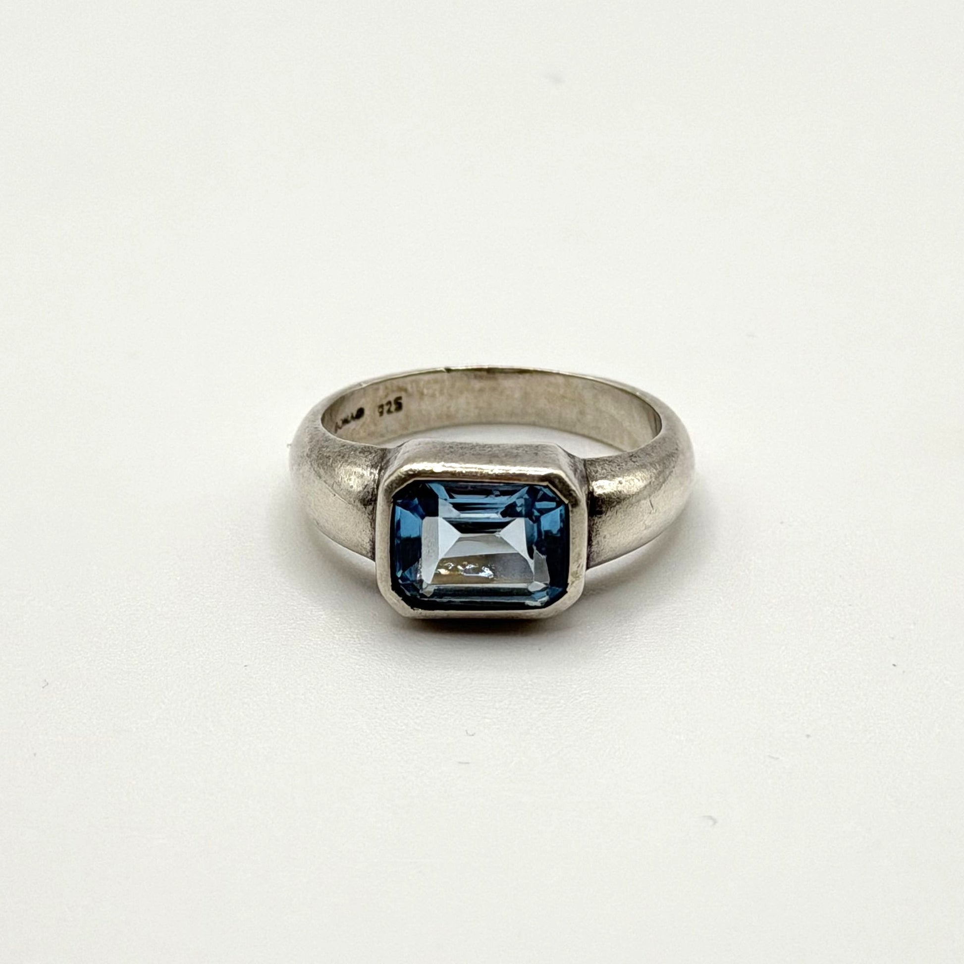 Crafted from 925 sterling silver, this ring features a bezel-set rectangular blue topaz gemstone, offering a timeless and elegant design for any jewelry collection.
