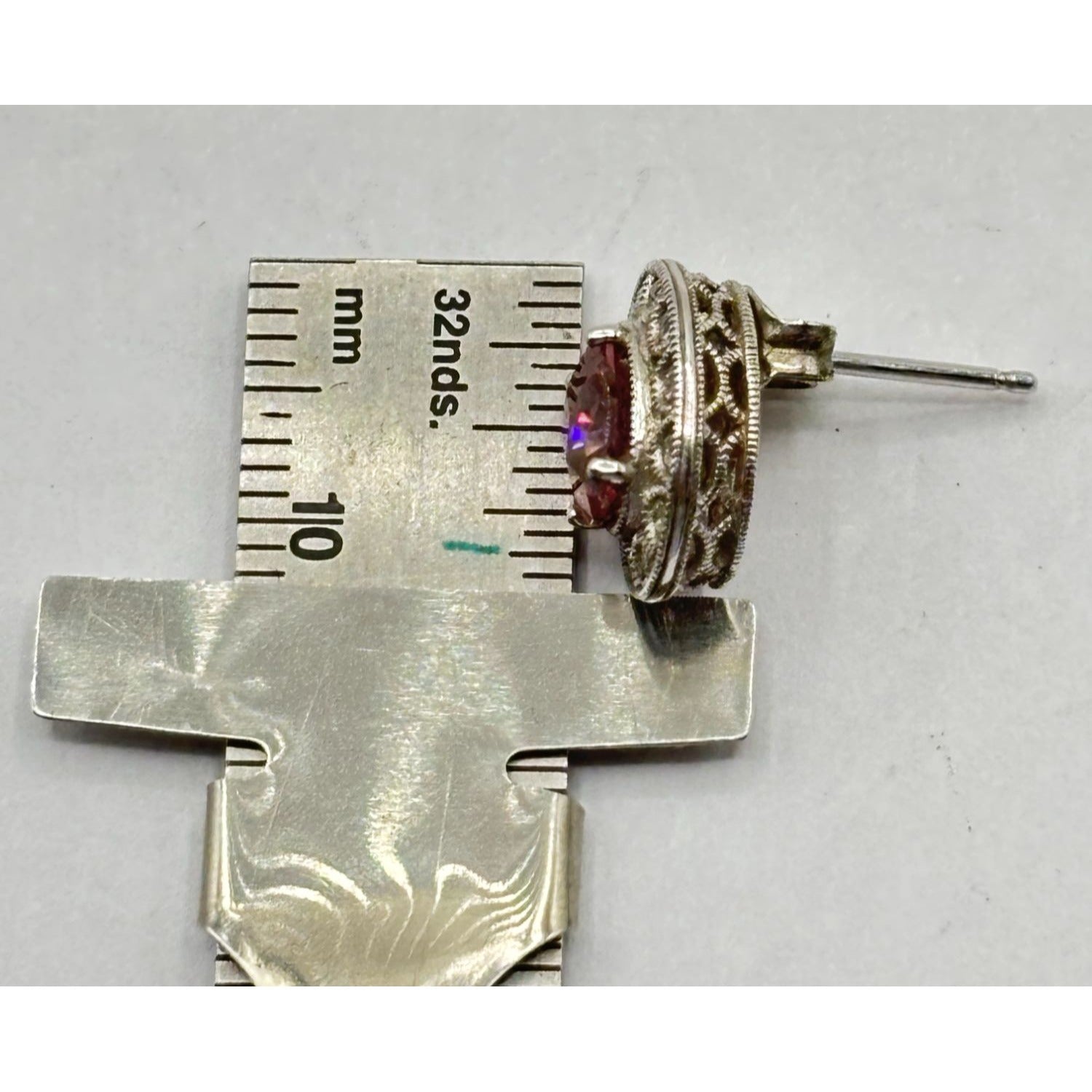 • Sterling silver construction • Pink CZ stones with halo design • Post back closure • Intricate metalwork detailing • Approximate diameter: 15 mm