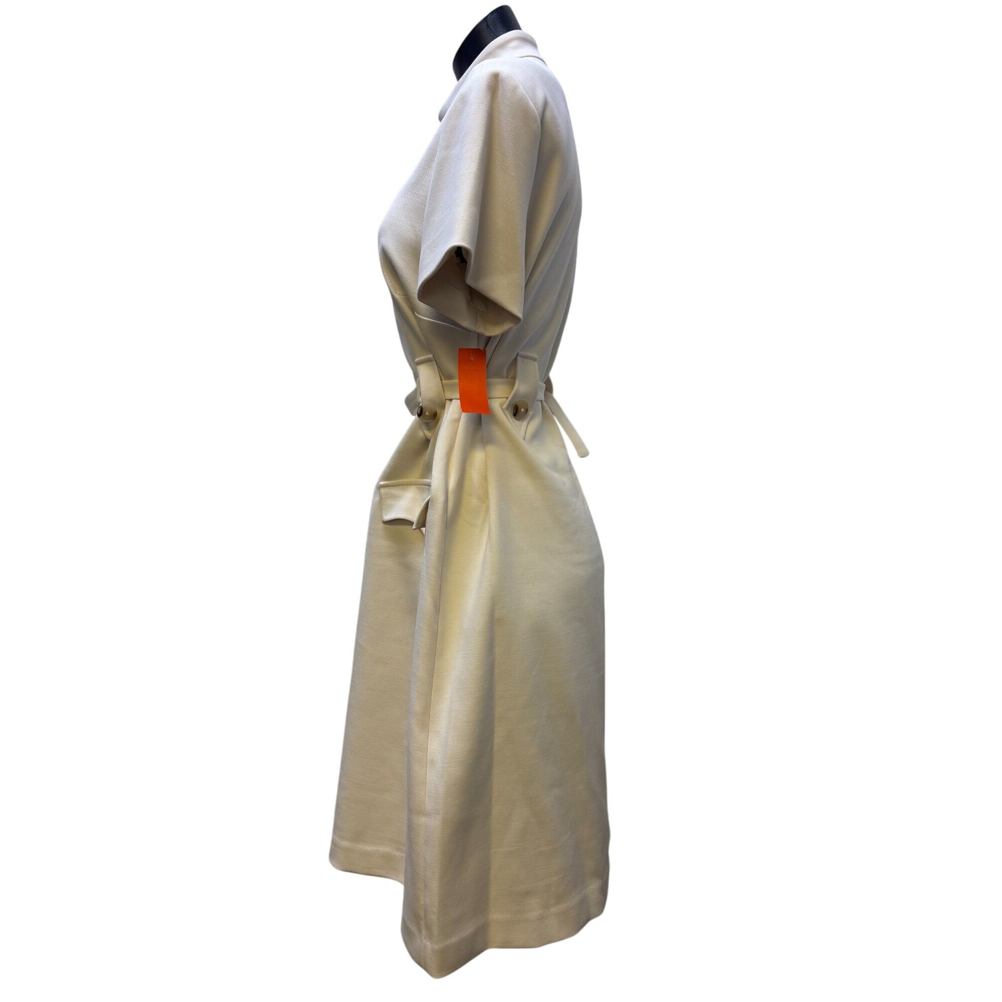 This J. Peterman dress exemplifies timeless elegance with its structured silhouette and belted waist. The cream color enhances its sophisticated appeal, making it a versatile addition to a professional wardrobe. Emphasizing a refined style, this dress combines classic design with modern detailing, suitable for various business settings.