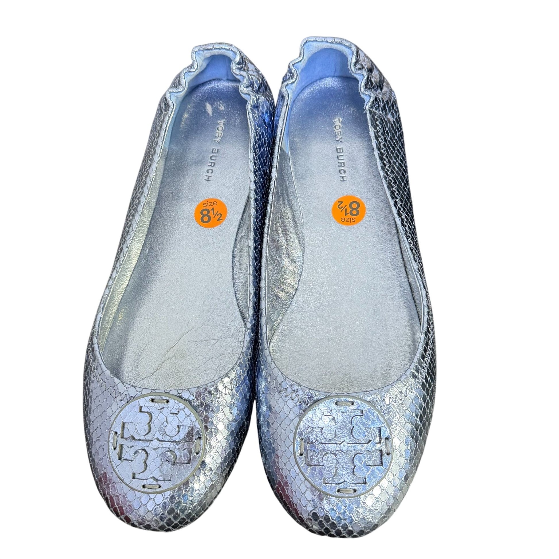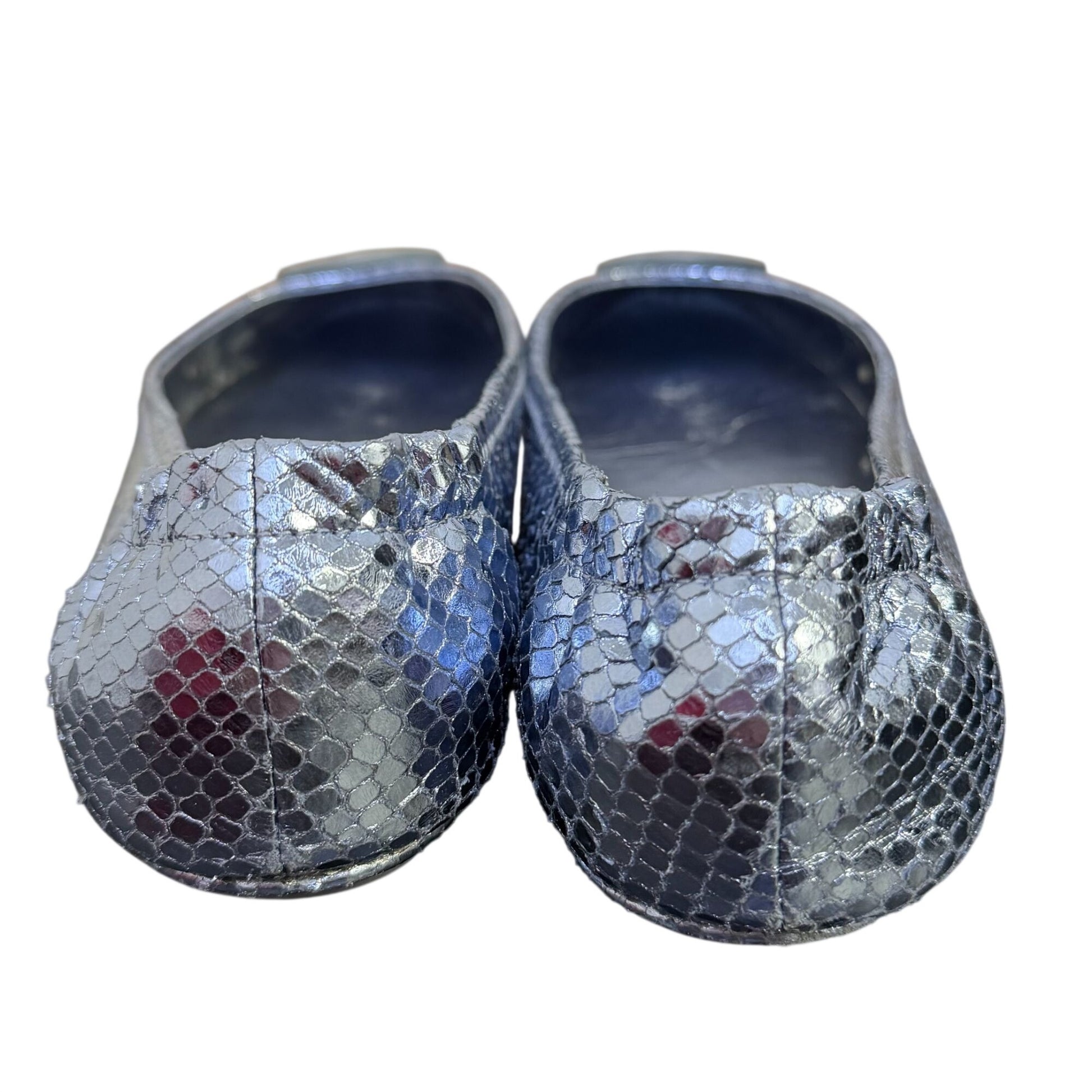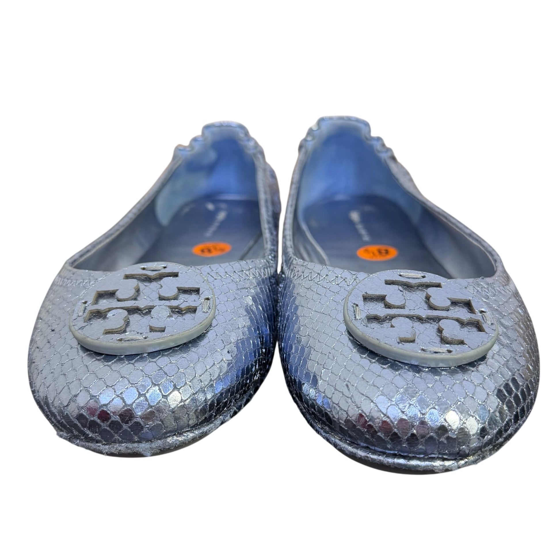 Tory Burch Metallic Blue Logo Flats Snake-Embossed Ballet Style Size 8.5