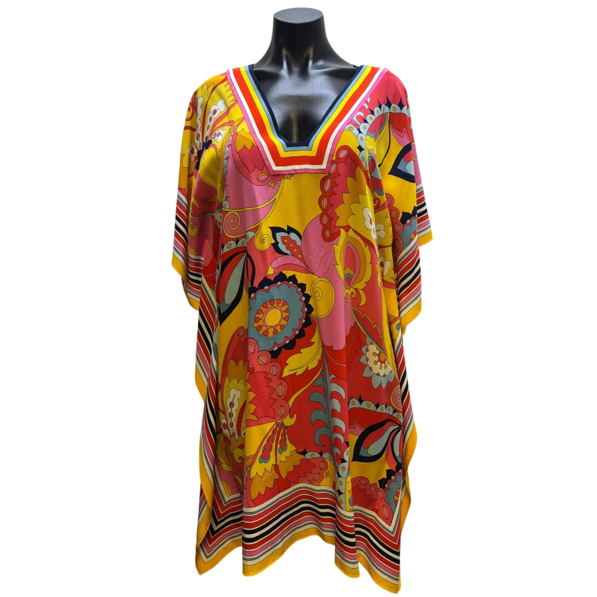 This Trina Turk tunic showcases vibrant colors and an intricate print, made from 100% silk, offering a luxurious feel and elegant drape. Its one-size design ensures a versatile fit, making it suitable for various body shapes. A colorful addition to any wardrobe, it's ideal for those who appreciate high-quality fashion.