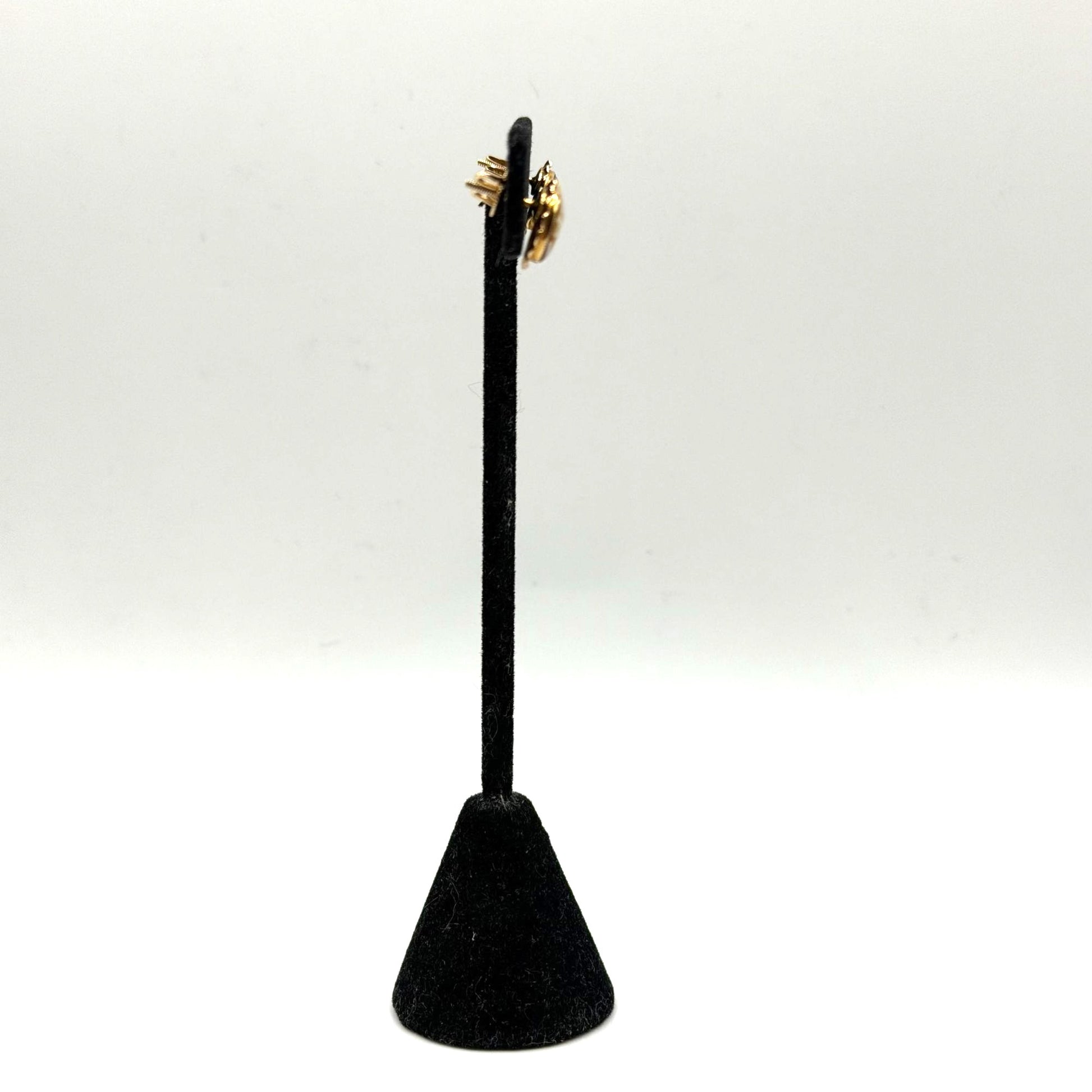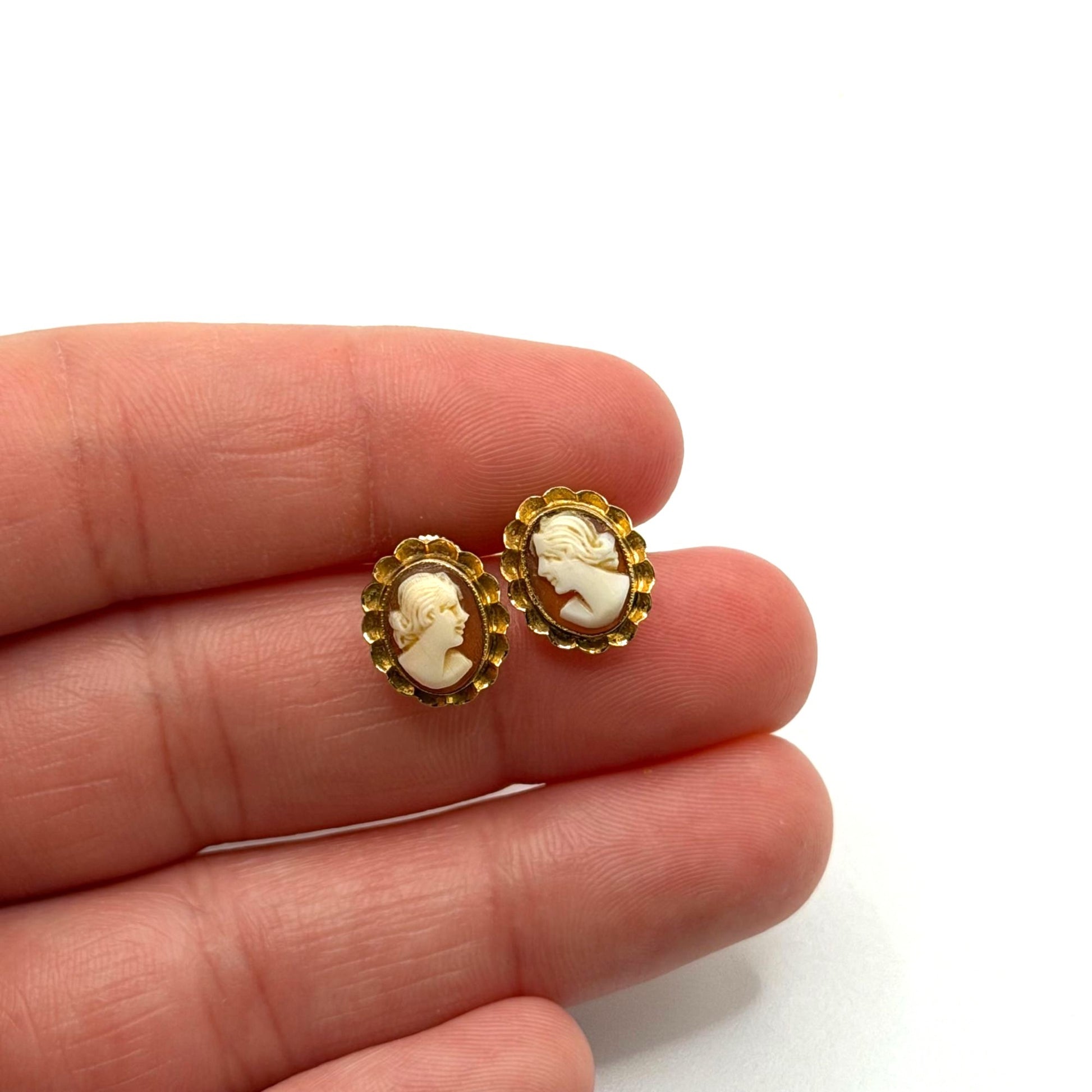 Elegant Victorian-era cameo earrings crafted in 10K gold with a screw-back closure. Features intricate oval designs and classic craftsmanship, ideal for collectors.