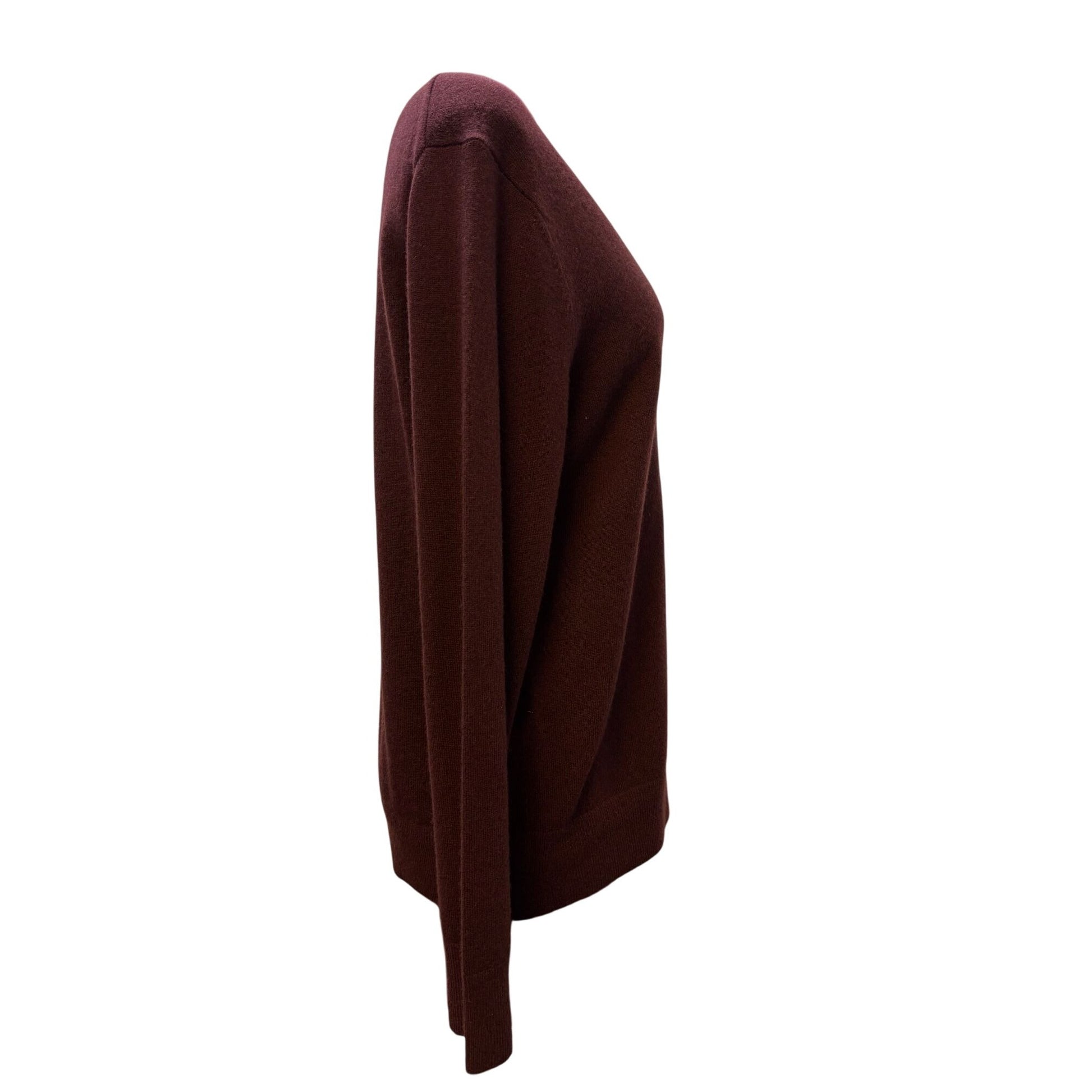 Luxurious cashmere sweater with a soft, smooth texture. Features a sophisticated V-neckline and a rich wine color for a timeless, elegant wardrobe addition.