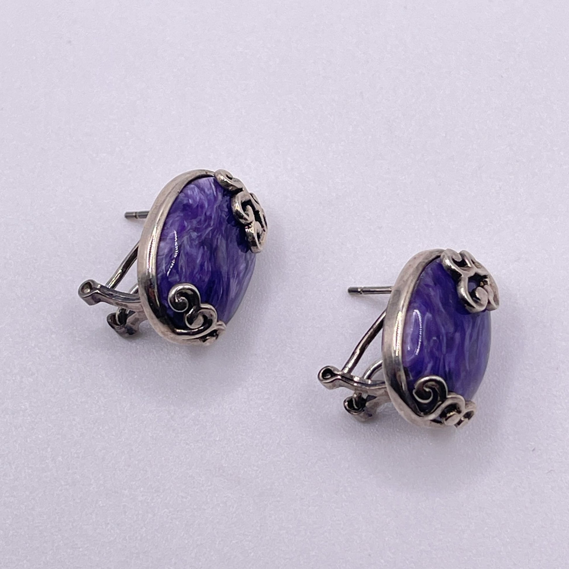 Vintage 925 Sterling Silver Oval Charoite Earrings Intricate Scroll Design