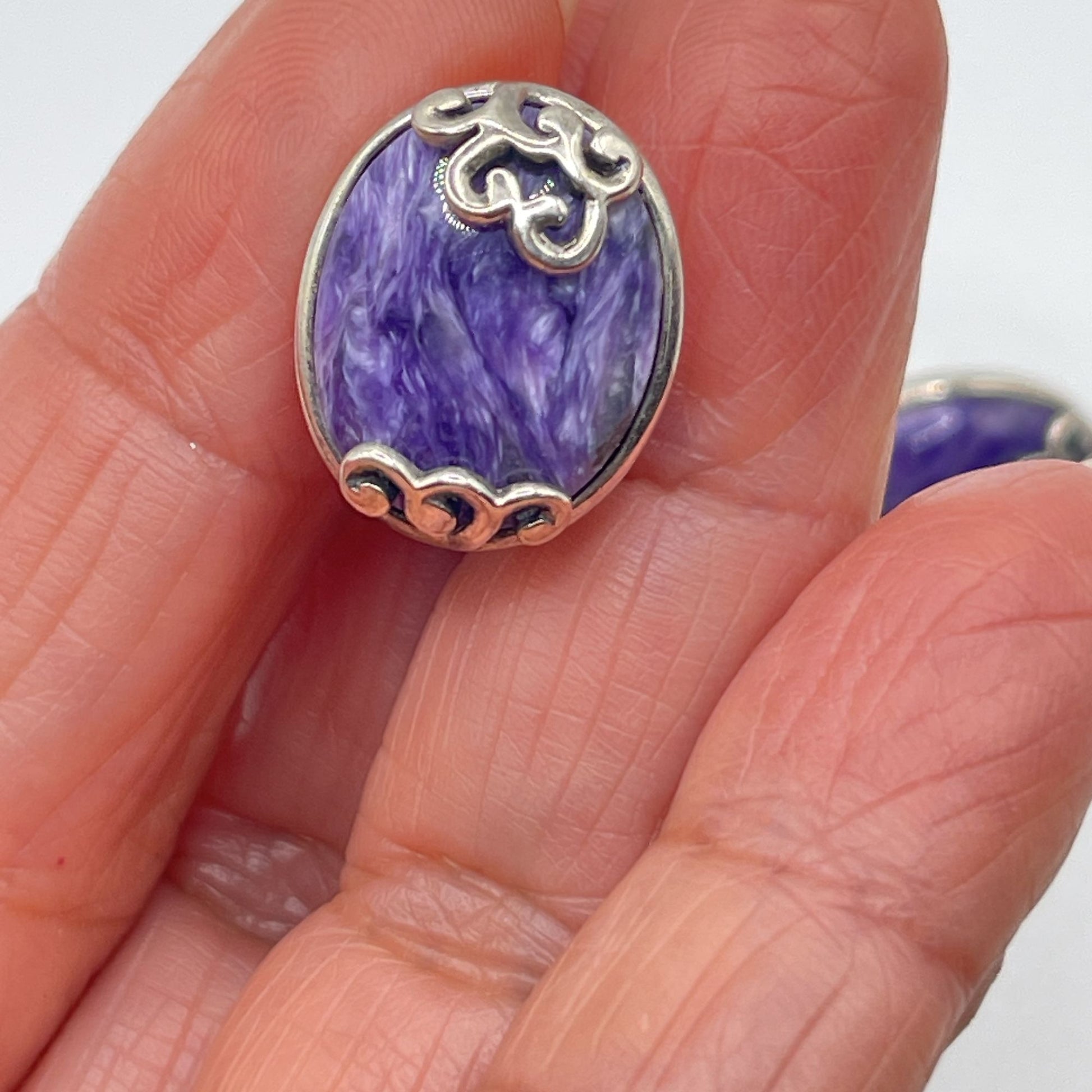 Elegant and timeless, these vintage sterling silver earrings feature rich purple charoite gemstones framed by intricate scrollwork, adding sophistication to any ensemble.