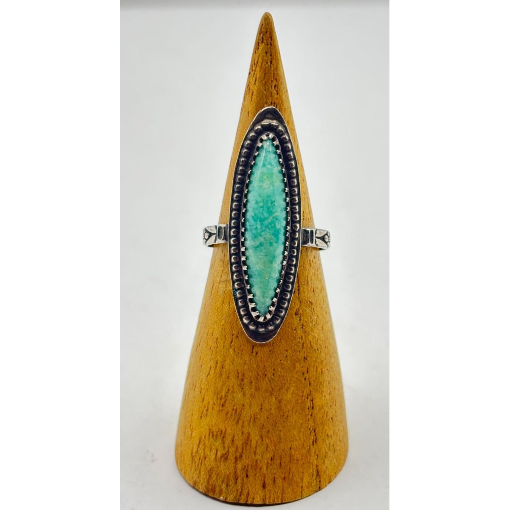 This vintage silver tone ring features a striking elongated turquoise stone, adding an elegant touch to any attire. Its intricate detailing on the band and setting showcases excellent craftsmanship, making it a timeless piece. The ring fits comfortably at size 7.5, making it a versatile accessory for various hand sizes.